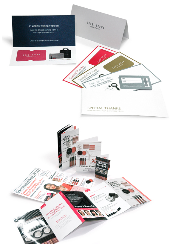 바비 브라운과의 디자인 작업에서 가장 중요한 포인트는 브랜드만의 고유 컬러를 살리고, 제품을 정확하게 소개해야 한다는 점이었다. 따라서 해당 브랜드의 모든 고객들이 긍정적인 에너지를 선사 받을 수 있도록 시원시원한 레이아웃 구성과 다양한 컬러를 강조한 폰트들을 사용했다. 다양한 형태의 제작물과 지속적인 리뉴얼 작업을 통해 바비 브라운만의 아름다움을 고객에게 전달하고자 노력한 것. 특히 실제 사용시의 팁을 추가한 뉴스페이퍼 구성의 DM과 펼치면 한눈에 들어오는 전 제품 카다로그, 고급스러움과 심플함을 강조한 VIP DM 등은 가독성이 높고 풍부한 읽을거리와 정보를 동시에 전달한다.