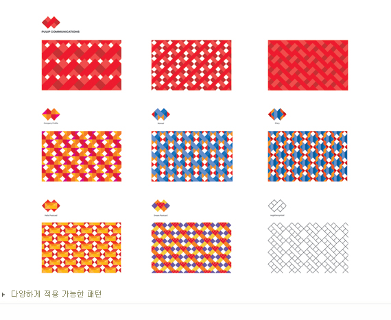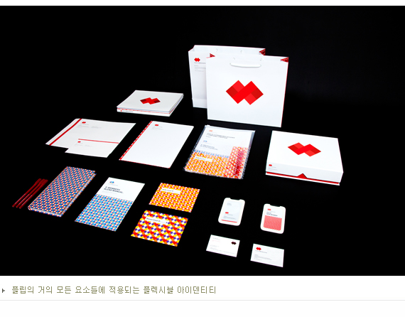 ‘Blend it’이 적용된 브랜드 시각화 작업은 플렉시블 아이덴티티(Flexible Identity)로 진행되었다. 플렉시블 아이덴티티를 차용한 이유는 앞서 말한 회사의 가치와 브랜드 콘셉트를 이야기하는데 있어 고정되어 있기보다는 유연함을 지닌 형태가 보다 적합했고, 지속적으로 회사의 가치를 이야기하기 위해서는 무엇보다 확장성이 필요하다고 판단했기 때문이다. 우선 기본형태는 ‘4 FORE PULIP‘, 회사의 4대 핵심가치를 표현할 수 있어야 했다. 무형의 가치를 시각화 한다는 작업은 꽤나 어려운 과정이었고, 수도 없이 많은 시행착오를 겪어야 했다. 유연함과 확장성도 염두해야 했기에, 최종적으로는 핵심가치를 표현하는 이미지에서 가장 단순화 된 형태를 끄집어냈다. 이미지를 단순화시켜 도출한 이 기본형태는 전체 브랜딩에 걸쳐 패턴으로 다양하게 드러나는 하나의 모듈로서 자리하게 된다. 그리고 컬러는 플립의 기존 메인 컬러였던 ‘레드(red)’에 +α(알파)를 두는 식으로 하여, 형태와 컬러 모두 가변성을 베이스로 조화롭게 섞이는 모습으로 표현했다.