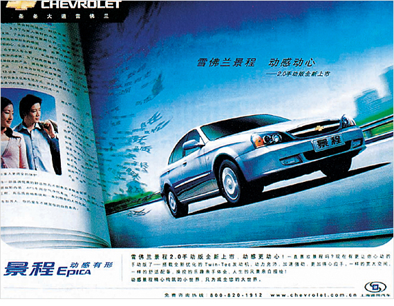 무엇으로 자동차의 동력이 강하다는 것과 속력이 세다는 것을 충분히 표현할 수 있을까? CHEVROLET은 책 표면의 글자를 선택하여 독특하게 보여주고 있다. 글자는 CHEVROLET가 달림과 동시에 모두 자동차를 따라 끌려가기 시작한다. 잡지 속 도화의 인물들 역시 그것에 이끌려고 있다. 이 과장된 표현은 간단하면서도 제품의 장점을 드러내 마음을 움직이게 한다. 소비자의 관심을 잘 일으킨다. 이와 같이 아무 상관없는 요소의 결합을 새롭게 참신함을 불러오는 것이다.