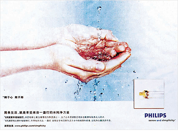 마음속에 담은 순수함, 심플함 이것은 필립스가 항상 추구하고자하는 목표이다. 1891년 회사 설립 이래, 필립스는 처음부터 끝까지 간단한 과학으로 사람들의 생활을 더 아름답게 만들 수 있을지 생각했고 이 광고는 회사의 이런 일관적인 생각을 계승하고 있다. 심플함을 이용해 아무런 꾸밈도 없는 손으로 깨끗한 물을 받고 있다. 과학의 인간적인 면을 강조할 뿐 아니라 동시에 기묘하게 제품의 기능을 표현해내고 있다. 소비자가 과학기술에 대해서도 감성적인 이해를 하도록 도와준다. 일석이조이다.