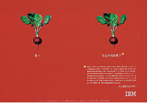 IBM은 끊임없이 창조적인 모습을 고객에게 보여주는 것은 그들이 대중과는 다르다는 것을 부각시켜 주었다. 이번에 무를 이용해 크게 비교해보이고 있다. 광고는 그 소박함을 유지하는 독특한 풍격은 화면의 시각적인 부분을 더 두드러지게 한다. 붉은색과 붉은색의 자극적인 느낌, 붉은색과 녹색의 보색 처리 역시 그렇다. 모든 평범함을 IBM은 비범함으로 바꾸고 있는 듯하다. 이것이 바로 이 브랜드의 매력이기도 한다.