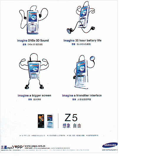 디지털제품의 주요 소비계층은 10대 20대의 젊은 층이다. 그들은 참신함과 유행, 오락적인 부분, 자유로운 느낌 또한 품질까지 모두 추구한다. 이로 인해 이 소비자 계층을 겨누어 광고의 참신함은 제품의 특성과 친밀함을 디자인하는 위에 두고 있다. 디지털 시대 소비자의 개성을 채워주고 있는 것이다. 삼성의 이 광고는 의인화 방법으로 제품의 특성을 이미지와 흥미롭게 보여준다. 이어폰이 각 각 다르게 신체의 언어로 나타나 또 다른 뜻을 전달하고 있다. 제품에 친밀감과 귀여움 친근감이 더해져 공감을 불러일으키는 효과가 있다.