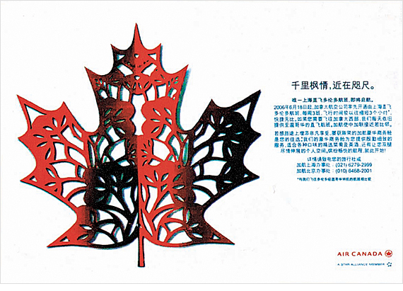 이 광고는 두 국가의 전통적 요소의 결합을 완벽하게 이끌어내었다. 중국의 민간예술인 종이오리기 공예-전지(剪紙)와 캐나다의 빨간 단풍잎으로 광고의 주제를 표현하였다. 이 두 가지 요소의 만남은 캐나다 항공사의 중간다리 역할을 나타내려 하고 있다. 중국과 캐나다를 왕복하는데 그 어떤 장애물도 있을 수 없다. 동시에 광고는 심플한 표현을 위해 흰색을 배경색으로 사용하였다. 선명한 종이공예의 단풍잎이 두드러지게 표현된다. 이 광고의 민족적 느낌이 가득 차있다.