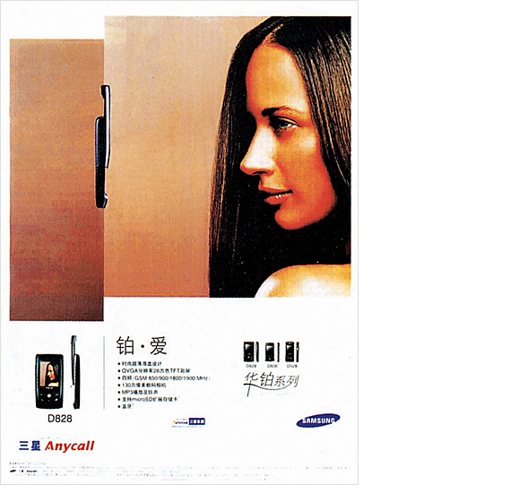 알레고리 방식을 이용하여 깊은 뜻을 드러내고 있다. ‘華-꽃’는 ‘滑-미끄러지듯’ 삼성 핸드폰 기계의 고전적인 슬라이딩 설계를 말하고 있고 ‘?-백금’은 ‘薄-얇다’과 상통하며 이 시리즈 핸드폰의 초슬림 설계를 표현하고 있다. 이외에도 더 깊은 층면 위의 “華滑”은 고귀하고 아름다운 품질을 가지로 있다는 뜻을 함축하고 있다. 슬라이딩, 초슬림 설계의 이 두 가지 점은 지금 시대의 유행에 부합하는 것이다. 또 슬라이딩, 초슬림 설계로써 새로운 유행을 선도하겠다는 자신감도 엿볼 수 있다. 광고화면 위의 참신함은 화면에 엇갈리는 층면의 처리이다. 심플하지만 한 번 보고도 특징을 바로 알 수 있다.