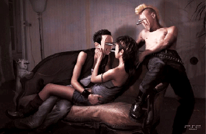 그리고 게임은 아무나 통정의 상대가 될 수 있다고 말한다. 이번엔 소파 위에서 하나가 되려는 남녀가 보인다. 그런데 이들의 얼굴은? 남자는 플러그 형이고 여자는 이를 꽂을 수 있는 콘센트로 서로 음양의 요철을 이루고 있는 것이다. 이렇게 이들은 플러그를 꽂아 쉽게 하나가 되고 통정을 한다. 게임이 그런 게 아닐까? 그 뒤론 다음 차례를 기다리는 듯한 남자가 서있다.