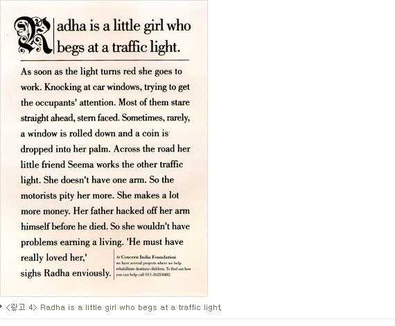 비주얼이라고는 찾아 볼 수 없이 문자만으로 만든 이 광고의 카피는 이렇습니다. “라다는 신호등 옆에서 구걸을 하는 어린 소녀입니다. - 신호등이 빨간색으로 바뀌자마자 그녀는 일을 시작합니다. 자동차 유리창을 두드리며 차 주인의 눈길을 끌려고 애를 씁니다. 대부분의 사람들은 준엄한 표정으로 앞만 바라봅니다. 때로, 아주 가끔 차창이 내려오고 그녀의 손바닥에 동전 한 개가 던져집니다. 길 건너에는 그녀의 작은 친구 시마가 다른 신호등 옆에서 일합니다.