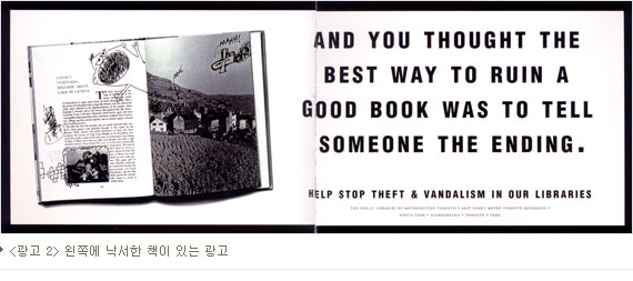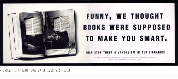 화면 왼쪽에 네모난 구멍이 생긴 책을 보고, 시선이 오른쪽으로 가면 커다란 글씨의 카피를 읽게 됩니다. “우습군요, 책은 원래 당신을 똑똑하게 만들어 주는 것이라고 생각했는데.” 그리고는 이어지는 작은 글씨의 카피로 눈이 갑니다. “우리 모두의 도서관에서 도둑질과 야만적인 행동을 하지 못하게 도와주세요. 메트로폴리턴 토론토 공공 도서관”. 복사기와 스캐너가 많지 않았던 시절에 이런 일이 많이 벌어졌지요. 요즘은 많이 나아졌을 줄 알았는데 도구만 변했더군요.
