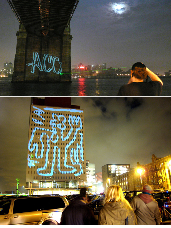 스프레이로 시작한 그래피티 예술이 디지털을 통해서 그 정신을 다시 한 번 표출해내고 있다. 미국 뉴욕에서 2년 전부터 활동중인 그래피티 리서치 렙(Graffiti Reseach Lab)의 L.A.S.E.R Tag는 그 중 대표적인 작품이다. 최근 국내에서도 광고 목적으로 프로젝터를 사용해 건물 벽면에 이미지를 투영하는 기법을 시도하고 있지만 이들은 순수 그래피티 예술 정신에 입각해 건물 벽면에 레이저를 이용한 그림을 그리는 데만 집중하고 있다. 아주 강한 녹색 레이저 빔(일반적으로 포인터 사용)을 건물에 쏘면 그 흔적에 맞춰 투영되는 프로젝터의 빛이 마치 건물 벽면에 그림을 그리는 것과 같은 효과를 내는 것. 누구나 손쉽게 컨텐츠를 생산해 낼 수 있으며 다양한 영상을 통한 주목도가 높다는 것이 특징이다. 이들은 홈페이지(www.graffitiresearchlab.com)에 모든 기술 및 사진 자료를 공개해 원하는 이들이면 언제든지 참여가 가능하도록 해 놓았다.