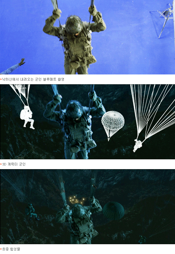 동막골 영화 전체를 통틀어 디지털 사람 캐릭터가 나오는 유일한 장면으로, 마을을 공격하기 위해 낙하산을 타고 내려오는 군인들 장면 입니다. 깜깜한 밤에 배우들이 낙하산을 타고 내려 오는 장면을 찍기란 힘들죠. 우선 화면 중앙에 크게 나올 군인 역할의 배우를 와이어에 달아, 내려오는 장면을 블루 스크린에서 찍고, 배경은 매트 페인팅해서 마을 전경을 만듭니다. 그 뒤로 보이는 군인들은 3D로 만들어졌습니다.