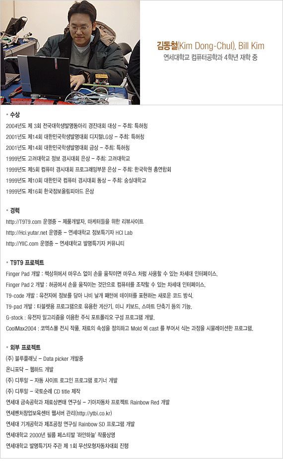 현재 대학교 4학년에 재학중임에도 불구하고, 김동철은 티구티구 제작을 위해서 그의 모든 시간과 노력을 결코 아끼지 않는다. Finger Pad와 최근에 개발중인 T9-code등의 최첨단 제품들은 특허를 내었거나 앞으로 특허를 내어 디지털 시대에 꼭 맞는 제품들로 거듭나게 될 것이다.