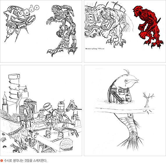 그러나 그런 것들을 볼 시간이 많이 없기 때문에 그냥 종이에 낙서를 하다가 얻기도 하고 잠자기 전에 생각하다가 영감을 얻기도 한다.
