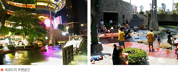 특히 시코트는 물로 들어갈 수 있게 하는 장소적인 설정으로 쇼핑몰의 입구에서 보이는 장식적이고 화려한 이미지를 유희적인 분이기로 전환시키며 하드엣지식의 식재, 휴식공간의 도입으로 보다 적극적인 수변 공간의 체험을 제안하고 있다.