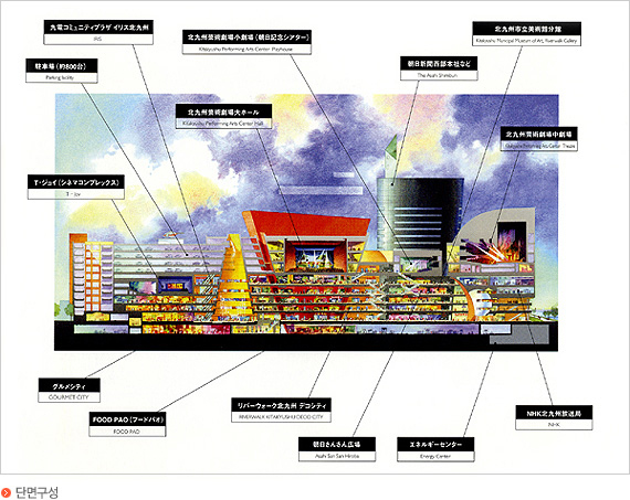 저층부에는 도로를 마주하여 숍을 배치하고 공원측으로는 숍과 레스토랑을 배치하여 인구의 유입을 자연스럽게 유도하고 상층부는 오락의 기능과 문화의 기능을 부여하고 800대의 주차를 수용할 수 있는 주차장을 설치하여 상승방향의 회유성을 증가시키고 있다.