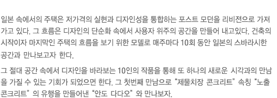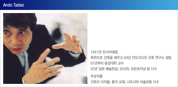 흔히 우리들이 잘 알고 있는 정식명칭으로는“제물치장 콘크리트” 속칭으로“노출 콘크리트”라고 불리 우는 것을 유행처럼 번지게 한 인물이인 안도 다다오. 그리고 그는 한국, 일본 학생들이 가장 많이 알고 습작을 많이 행하는 인물 중 한 사람이다.
