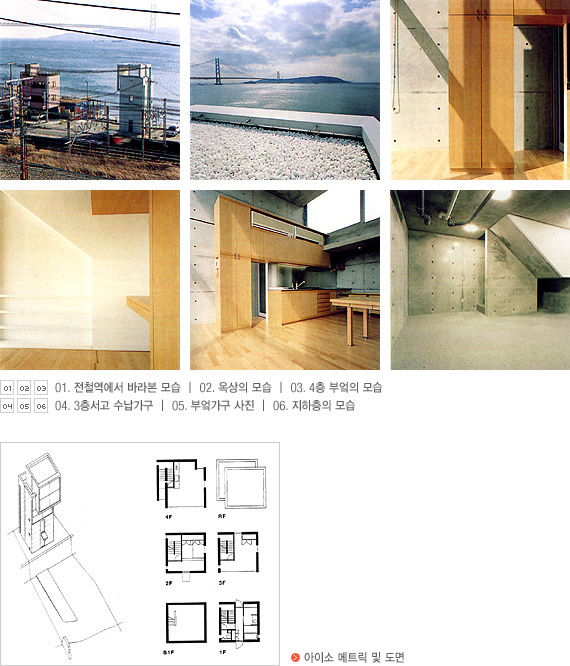 엄밀하게 말한다면 4.75m x4.75m의 정방형 플로어를 층층이 쌓아 올리는 방법으로 지어진 지하1층, 지상4층의 건물이다.