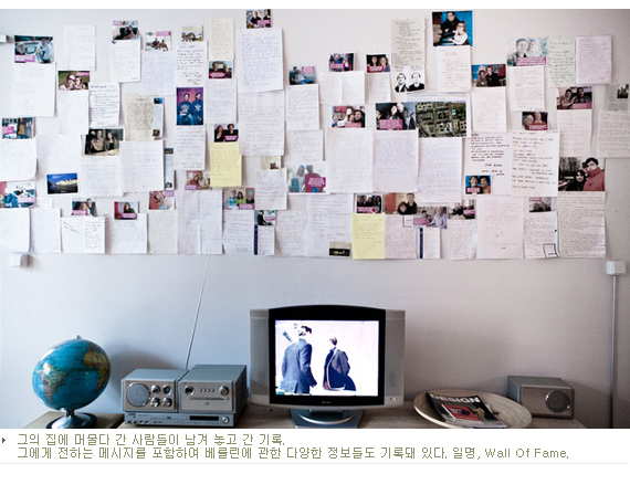 우리 집을 방문하는 사람들에겐 언제나 베를린에 관한 정보를 알려준다. 베를린의 역사, 동과 서를 가르던 베를린 장벽에 관한 이야기, 이곳에서 꼭 가봐야 할 곳 같은 것들 말이다. 가끔은 그들의 여행 안내자로도 나선다. 집의 한쪽 벽에는 ‘Wall of fame’이라는 공간이 있다. 사람들이 멋진 카페나 식당에 들러 방문 흔적, 메모를 남기는 것처럼, 우리 집에 머물렀던 여행자들이 추천하는 장소, 맛집 등을 적어 놓은 것이다. 이런 것들 하나하나가 쌓여서 한쪽 벽을 꽉 채우게 되었다. 또, 실내장식이나 가구에 관심이 있는 사람에게도 내가 아는 것들에 한해선 자세하게 설명해 준다. 내가 먹고 자고 하는 내 집이기 때문에 벽이며 가구들이며 다 저마다의 사연이 있다. 60년대에 병원에서 쓰던 의자, 내가 좋아하는 베를린 디자이너가 만든 테이블, 이웃집 화가에게 영감을 얻어 색칠한 벽, 그리고 내가 만든 DIY 가구까지, 이러한 이야기를 들려주면 사람들은 재미있어한다. 그럼 나도 즐겁다.
