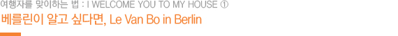 사람들은 ‘Le Van Bo’를 가리켜 프라임(Prime)이라 부른다. 그의 집을 이용해 본 방문객들은 그를 ‘최고의 호스트’라고 생각한다. 따뜻함이 공존하는 그의 공간에서는 사랑이 시작된다. 앞으로 그의 집에선 더 많은 역사가 시작될 것이다. 이제는 ‘먹는 대로 돈을 내야 하는 호텔 냉장고’는 필요 없다. 깃발 부대는 이제 촌스럽다. 베를린에 관한 좋은 정보만 꿰차고 있는 든든한 여행 안내자이자, 가구 하나를 만들어도 삶의 질을 제일 먼저 생각하는 사람이 여기 있다. 그의 손길이 닿은 의자에 엉덩이를 붙이고, 그가 디자인한 테이블 위에 놓인 그가 준비해 둔 과일을 먹고, 벽 쪽으로 가서 그의 집을 방문한 사람들이 적어 놓은 메모에서 가고 싶은 카페를 골라 찾아간다. 가는 길에 그가 알려준 집 근처 빵집에 들러 독일 빵을 하나 사 먹는 것도 잊지 않는다.