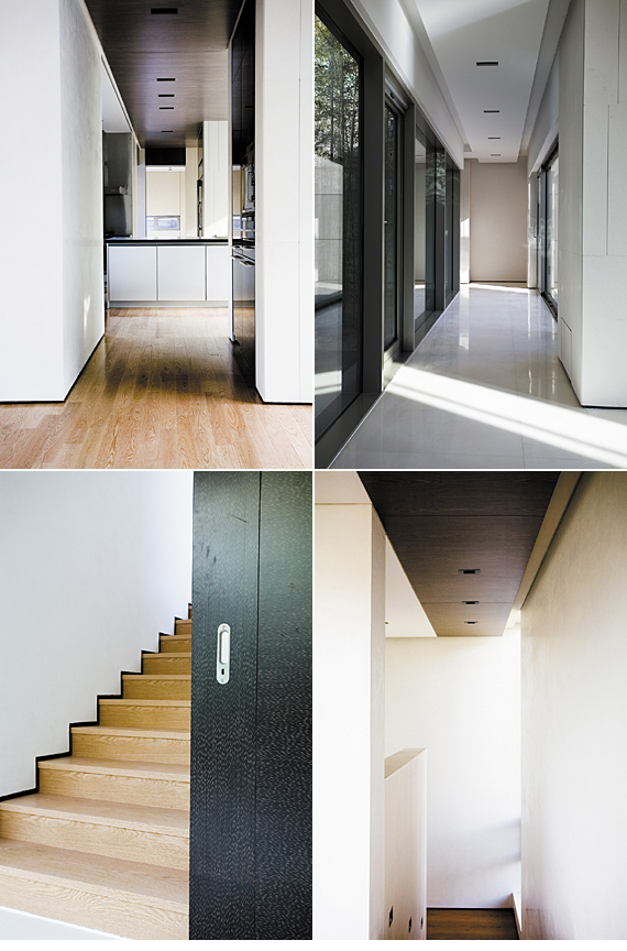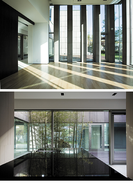 주방에서 거실공간을 가려면 중정 공간을 휘둘러 가야 한다. 중정을 중심으로 모든 동선이 휘둘러 걸어야 하는 구조로 구성되었다. 이 구조는 자녀방이 있는 2층에도 동일하게 적용된다. 거실공간은 수직적인 기둥을 두어 시점에 따라 공간의 시각적 개폐가 가능하다. 시간에 따라 투과되는 빛의 각도나 양에 따라 거실은 표정은 다양하게 변한다.