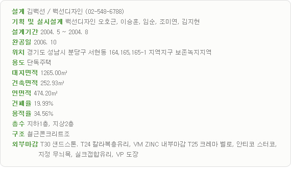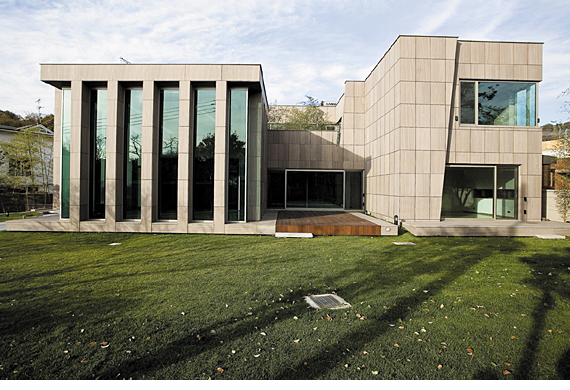 ‘주택 치고는 크다’라는 첫 느낌이 들었다. 외관의 느낌 또한 덧붙여 지지 않은 평평한 형태가 시각적으로 건물을 더 크게 느껴지게 한다. 2004년에 설계하여 최근에야 완공이 된 워킹 스페이스는 분당 서현동 작은 주택가에 자리한다. 외관은 거대한 신전의 축소된 모습을 연상케 하기도 하고 차분한 뮤지엄을 떠오르게도 한다. 이 공간을 설계한 김백선 소장은 이와 같이 ‘플랫’한 형태를 선호한다고 한다. 수직적인 변화를 형태적으로 표현하기 보다는 수평한 공간에 평평하게 이어지는 공간이 좋다고 말한다. 사실 평이해 보이고 커다란 매스감만 느껴지게 할 수도 있다는 단점이 있다. 하지만 공간의 이해와 공감은 드라마틱한 공간 변화와 전이에서만 느낄 수 있는 것이 아니기에 그의 기호가 공감이 간다.