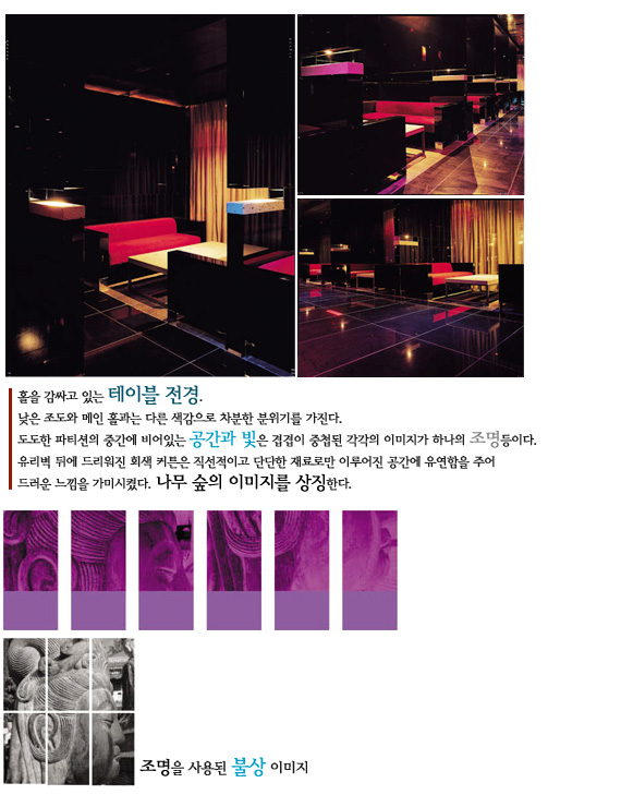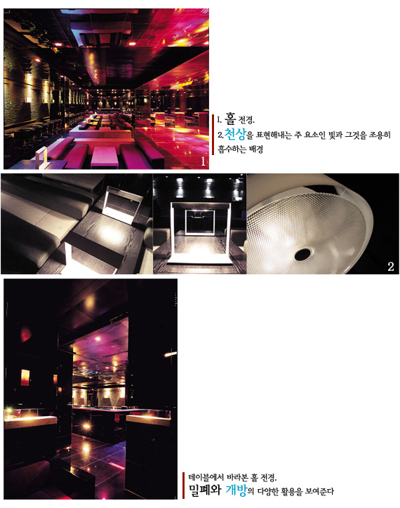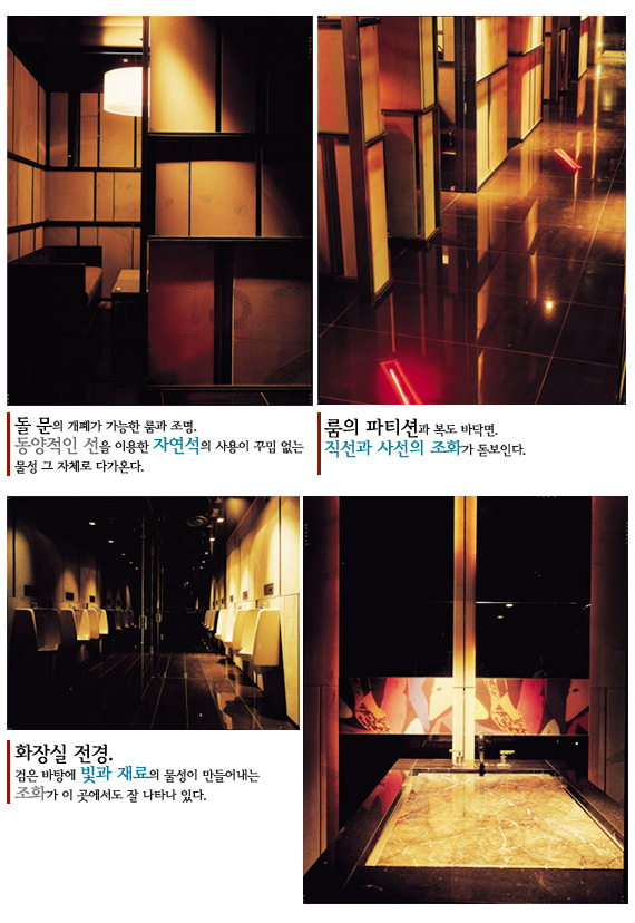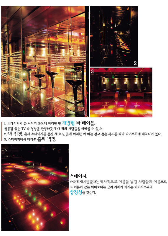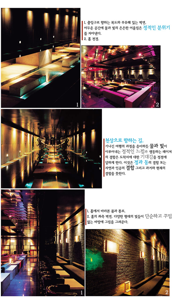 밀폐된 공간에서 술을 마시며 노래를 부르고 싶은 사람, 독립된 공간에 있으되 활기찬 바깥 분위기를 느끼고 싶은 사람, 마음껏 춤추고 싶은 사람, 그리고 춤추다 쉬고 싶은 사람, 한 걸음 뒤로 물러서 분위기를 느끼다 춤도 한번 춰보고 싶은 사람, 외롭게 바에서 술을 음미하고 싶은 사람… 이들이 자유롭게 분리되면서도 어울리고 소통할 수 있게 되는 것이다. 이렇게 모인 다양한 사람들이 자연스럽게 동화되는 공간은 기능적인 요소만으로 해결되지는 않는다. 다양한 세대와 다양한 요구를 반영하듯, 이 곳에서는 두 개의 상반된 요소가 어울려 공존하고 있다. 출입구에서 내부로 향하는 복도에 위치한 물과 나무 그리고 벽면을 이루는 돌로부터 발산되는 정적인 분위기는 쉼 없이 움직이고 색을 바꾸어가는 테크노적인 레이저 광선과 소리를 흡수하면서 하나의 결합체를 만들어낸다. 또한, 테이블과 벽면에 사용된 자연석의 거친 물성은 그 어떤 첨단 재료와 결합하여도 오랜 세월 존재했던 그들의 존재를 조용하면서도 무게 있게 드러내고 있다.