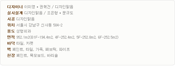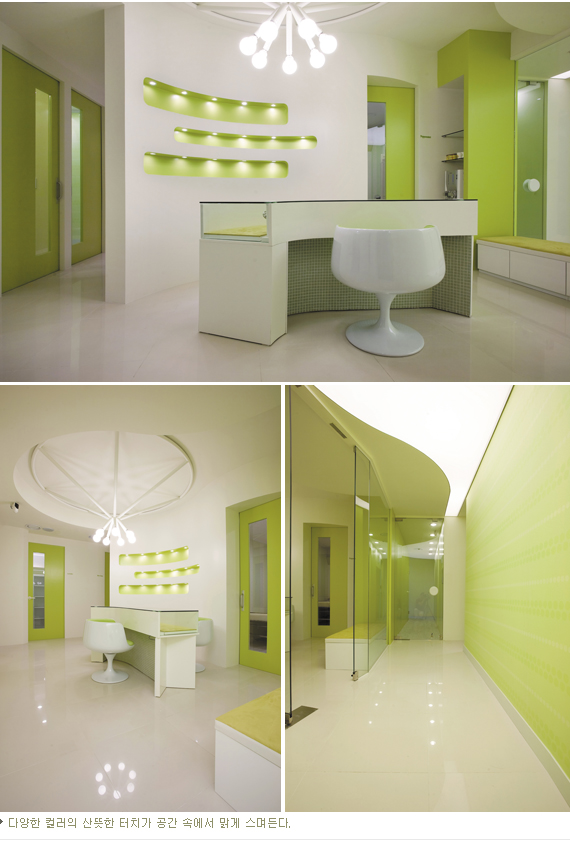 회화를 전공한 디자이너가 그려내는 다양한 컬러의 산뜻한 터치가 공간 속에서 맑게 스며드는 이유 때문인지, 디자인맑음의 공간은 이름 그대로 ‘맑다’라는 분위기가 전해지는 프로젝트로가 많다. 특히 병원공간은 디자인맑음의 장점인 어두움 보다는 밝은 콘셉트가 잘 드러난다고 볼 수 있다. 더욱이 이번 프로젝트는 공간디자인을 통한 배려에 관심이 많던 클라이언트와의 조화로 한 단계 업그레이드 된 ‘맑음’을 보여주고 있는 것이다.