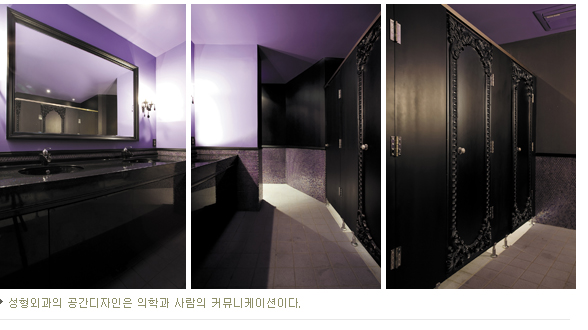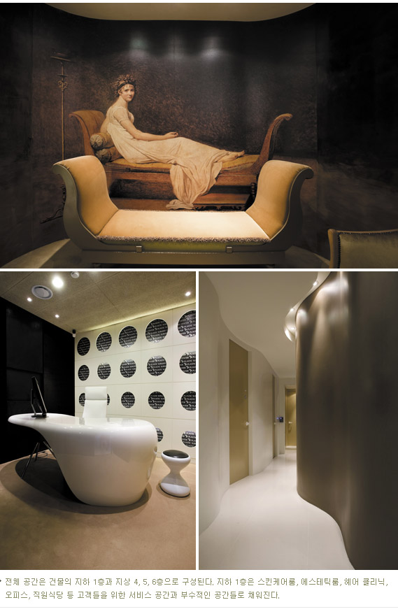 전체 공간은 건물의 지하 1층과 지상 4, 5, 6층으로 구성된다. 지하 1층은 스킨케어룸, 에스테틱룸, 헤어 클리닉, 오피스, 직원식당 등 고객들을 위한 서비스 공간과 부수적인 공간들로 채워진다. 메인 입구는 4층에 자리한다. 고객들이 처음 맞이하는 4층의 홀에서는 기운생동(氣韻生動)하는 자연을 모티브로 비주얼적인 메시지를 담아내는데 주력하고 있다. 홀은 곡선의 유기적인 움직임이 마치 공간이 살아있다는 느낌을 연출한다. 여기에 가볍고 기운이 넘치는 자연의 재료와 색상들을 덧붙여 재탄생의 생명력을 표현하고 있다. 상담실은 4 ~ 5층에 걸쳐 여러 곳에 자리하는데 고객의 나이, 성별 등에 따라 시술부위가 달라지고, 시술부위에 따라 그 기능에도 차이가 있기 때문에 각각의 상담실들은 그에 따른 미세한 차이를 두었다. 특히 4층의 상담실 중 한곳에는 19세기 프랑스의 유명작가인 다비드의 초상화를 두었다. 이 초상화의 주인공은 19세기 당시 아름다운 미모로 이름을 떨쳤던 레카미에 부인으로 이 시대 명의에게 자신의 아름다운 얼굴을 맡긴다는 비유적 표현이 공간의 요소로 쓰인 것이다. 그리고 홀과 몇 상담실은 콘셉트적 상상력을 그려낸 것에 비해 수술실, 입원실, 치료실 등에는 하이테크니컬한 기능성에 집중하였다.