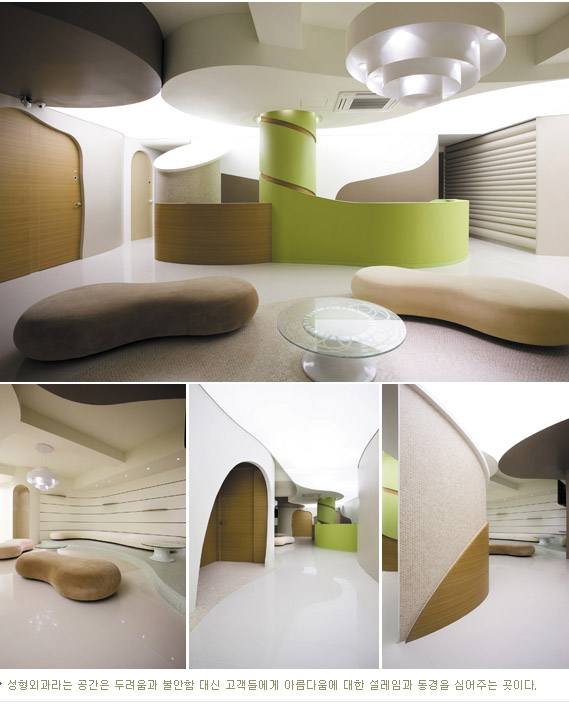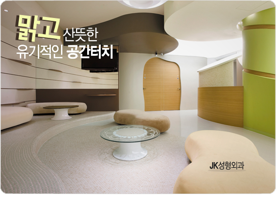 아름다움에 대한 본능은 만물의 활력을 불어넣는 생성인자와도 같다. 그것은 마치 흐르는 물과도 같이 사람들의 뇌리를 타고 이곳 저곳 전파되며 삶의 흐름을 변화시키게 된다. 아름다워지고자 하는 욕망은 인간 내면에 뿌리 깊이 자리한 본능이자 염원인 것처럼 미(美)를 구현하는 공간 중의 하나가 성형외과이다. 현대의학은 이제 미에 대한 인간의 염원을 구체적인 모습으로 현실화 시켜주었고, 그 가운데에 성형외과의 공간디자인이 의학과 사람의 커뮤니케이션으로 이어주며 튼실한 배경으로서 작용한다. 성형외과를 찾는 사람들의 마음 속에는 어떤 심리들이 있는 것일까? 아름다워질 수 있다는 설레임으로 가득 차기도하고, 수술에 대한 두려움도 있을 것이다. 그렇기에 성형외과라는 공간은 두려움과 불안함은 최대한 감추고, 고객들에게 아름다움에 대한 설레임과 동경을 심어주는 곳이어야 하는 것은 자명하다. JK 성형외과는 이러한 과제들을 자연의 생명력을 공간에 도입함으로써 풀어가고있다. 자연을 연상시키는 컬러나 형태, 그리고 재료들로 마치 새로운 생명이 탄생하기 직전의 움직임을 은유적이고 비유적으로 표현하여 고객들에게 새롭게 태어날 자신의 모습에 대한 기대감을 높이고, 수술에 대한 두려움을 덜어주고 있다.