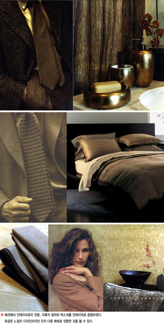 지난 5월 11일 Elle Decor 주최로 New York Design Center에서 열린 'An Evening with Elle Decor' 에서는 세 명의 패션디자이너가 각각 자신들이 생각하는 인테리어 디자인에 대해 프리젠테이션을 하였는데, 그 중 JA Apparel Corp.의 사장 Joseph Abboud는 패션과 인테리어를 단지 평면과 입체의 차이일 뿐이라고 이야기하며 이 두 분야를 접목시킨 자신의 디자인을 소개하였다.