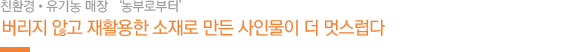 흙을 믿고 햇살이 주는 고마움을 아는 농부와 함께 하는 ‘농부로부터’의 친환경•유기농 식품매장을 다녀왔다. 그냥 둘러만 봐도 재미난 이곳은 환경을 생각하고 땀 흘려 열매를 거두는 농부를 배려한 흔적들이 매장 곳곳에 묻어난다. 버리지 않고 있는 그대로 재활용한 매장 사인물 또한 너무나 정겹다.