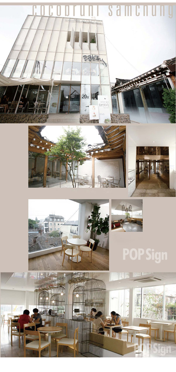 코코브루니 삼청점은 본건물과 한옥체를 결합한 구조로 현대와 전통이 공존한다. 옛스러움을 간직하고 있는 삼청동 거리풍경을 창을 통해 바라볼 수 있다.