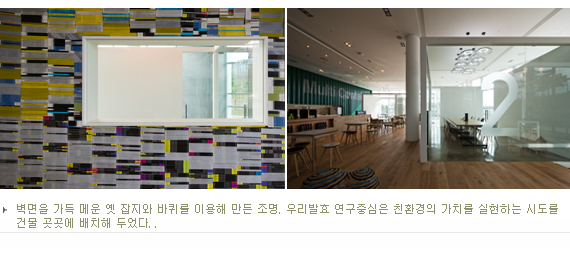 전체적으로 ‘우리발효 연구중심’은 “RECYCLE, REDUCE, REUSE”를 콘셉트로 정하고, 친환경적인 가치를 담아내고자 했다. 이월호 잡지로 쌓은 벽면과 버려진 바퀴와 파이프로 만든 조명 등은 인위적이기보다 자연스러움을 추구한다. 건물 곳곳에 있는 이러한 요소들은 일상의 대부분을 보내야 하는 연구원들에 대한 배려에서 비롯되었다. 일만 하는 공간이 아니라, 즐거움을 함께 공유할 수 있어야 한다는 생각에서 각종 편의시설을 만들었다. 다양한 형태의 미팅룸과 모든 사람이 여유롭게 즐길 수 있는 카페테리아, 야외 바비큐 시설을 갖춘 질러 놀이터, 감각적인 인테리어가 돋보이는 화장실 등은 그 예가 될 것이다.