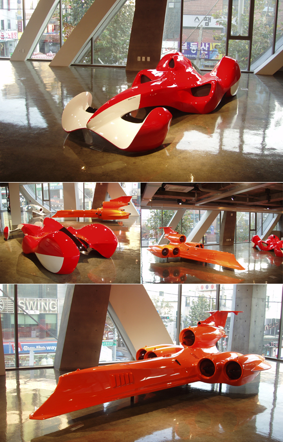 매끈한 합성수지와 환각적인 공간을 열어주는 채색과 광택. 검은 윤활유와 기름으로 번뜩이는 기계의 움직임과 그 궤적을 인류가 지난 세월 체감해 온 속도의 경험과 연결시킨다. 고대 몽고의 기마병이 보여준 놀라운 기동성과 무력(武力), 2차 세계대전의 독일 기갑사단이 보여준 전격전, 태평을 종횡무진 누비는 미국의 항모(航母)들, 그리고 음파의 속도를 넘어선 전투기들과 자동차 경주에서 발휘되는 포뮬러.