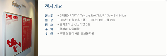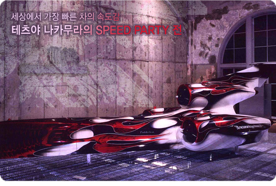 상하이 비엔날레 등 국제적인 전시에서 작품을 선보이며 일본의 촉망 받는 신예 팝아티스트로 떠오른 테츠야 나카무라의 개인전이 갤러리 상상마당에서 열리고 있다. ‘SPEED PARTY’라는 제목의 이번 전시에선 ‘세상에서 가장 빠른 차’의 속도감을 실제 크기의 경주용차 모형으로 제작하여 외형과 실제 기능 사이의 간극에 의문을 던지는 작품들을 만나 볼 수 있다.