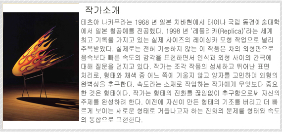 일본의 촉망받는 신예 팝아티스트 테츠야 나카무라(Tetsuya Nakamura)의 작품은 속도를 표면에 가둬 놓은 듯 표현하고 있다. 불을 뿜는 포뮬러의 열정과 엄청난 속도 그리고 강인한 힘을 보여줄 것 같은 유려한 동체의 반짝이는 광택은 우리의 시선을 사로잡는다.