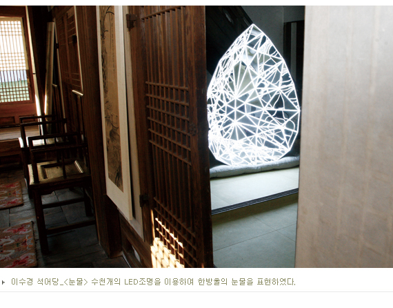 ‘덕수궁 프로젝트’는 덕수궁의 중화전, 행각, 함녕전, 덕홍전, 석어당, 정관헌 등 6개 전각과 후원에서 총 9개의 프로젝트로 진행된다. 또한 덕수궁 미술관의 내부전시는 프로젝트 진행 과정에서 완성된 작품과 영상으로 덕수궁 경내 전시의 연장선상이라 할 수 있다. 한국 현대 미술계의 유명한 작가, 디자이너, 무용가, 공예가, 미디어아티스트 등 12명이 참여한 ‘덕수궁 프로젝트’에서는 전통적인 조각•설치, 사운드아트, 퍼포먼스, 공연 외에도 다양한 영상과 미디어 맵핑을 통한 작업들을 볼 수 있다. ‘덕수궁 프로젝트’에서 LED조명을 이용하여 작업한 이수경작가의 ‘눈물’은 석어당에 전시되어 있다. 석어당은 경운궁의 시원을 이루는 오랜 역사를 지닌 곳이다. 이수경 작가는 덕수궁의 비극적 운명을 상징하는 것처럼 보이는 이 소박한 건물에 눈부신 눈물조각을 설치하였다. 이 조각은 수천개의 LED 조명에 의해 굴절되고 반사되면서 정확히 그 형체를 알아볼 수 없다. 아프지만 아름답고, 빛나지만 잘 보이지 않는 이 역설적인 조각은, 역사적 소용돌이 속에서 한 인간으로서 삶을 꾸려갔던 수많은 궁궐 속 여인들의 운명을 상징한다.